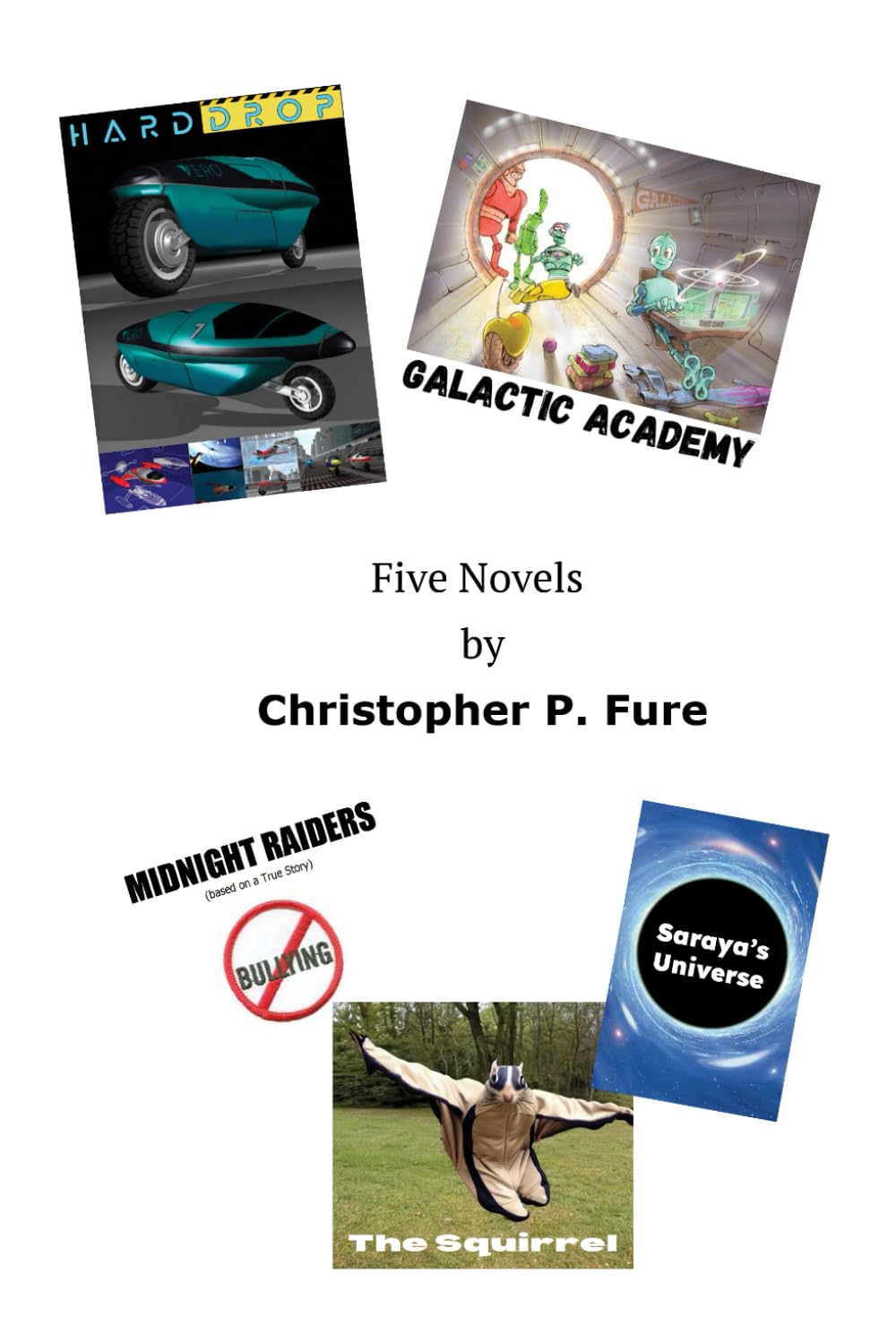 Published by Mega Mass Press, is an anthology of my fictional stories: “Hard Drop,” “Galactic Academy,” “Midnight Raiders,” “The Squirrel,” and “Saraya’s Universe.” The novels depict entertaining and inspirational hero journeys: flawed characters who overcome long odds in the realms of future motorsport, alien robot society, outsmarting school-yard bullies, comical vigilante justice, and astrophysics discovery, respectively.