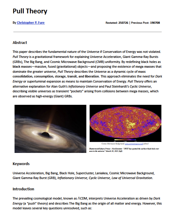My astrophysics paper Pull Theory describes the fundamental nature of the Universe if Conservation of Energy was not violated. Pull Theory is a gravitational framework for explaining Universe Acceleration, Giant Gamma-Ray Bursts (GRBs), The Big Bang, and Cosmic Microwave Background (CMB) uniformity. By redefining black holes as black masses—massive, fused (gravitational) objects—and proposing the existence of mega masses that dominate the greater universe, Pull Theory describes the Universe as a dynamic cycle of mass consolidation, consumption, storage, transit, and liberation. This approach eliminates the need for Dark Energy or superluminal expansion as means to maintain Conservation of Energy.