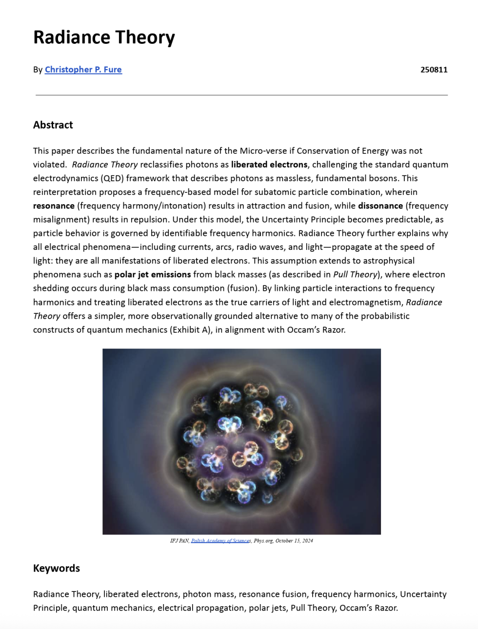 My astrophysics paper Radiance Theory describes the fundamental nature of the Micro-verse if Conservation of Energy was not violated. Radiance Theory reclassifies photons as liberated electrons, challenging the standard quantum electrodynamics (QED) framework that describes photons as massless, fundamental bosons. This reinterpretation proposes a frequency-based model for subatomic particle combination, wherein resonance (frequency harmony/intonation) results in attraction and fusion, while dissonance (frequency misalignment) results in repulsion. Under this model, the Uncertainty Principle becomes predictable, as particle behavior is governed by identifiable frequency harmonics. Radiance Theory further explains why all electrical phenomena—including currents, arcs, radio waves, and light—propagate at the speed of light: they are all manifestations of liberated electrons.